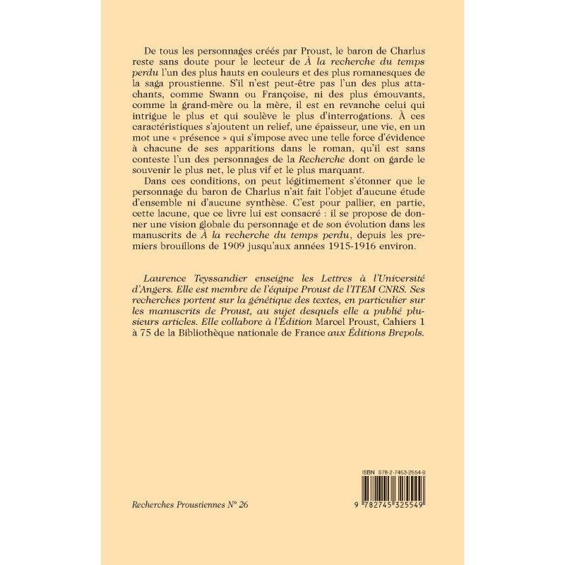 De tous les personnages créés par Proust, le baron de Charlus reste sans doute pour le lecteur de « À la recherche du temps perdu » l’un des plus hauts en couleurs et des plus romanesques de la saga proustienne. S’il n’est peut-être pas l’un des plus attachants, comme Swann ou Françoise, ni des plus émouvants, comme la grand-mère ou la mère, il est en revanche celui qui intrigue le plus et qui soulève le plus d’interrogations. À ces caractéristiques s’ajoutent un relief, une épaisseur, une vie, en un mot une « présence » qui s’impose avec une telle force d’évidence à chacune de ses apparitions dans le roman, qu’il est sans conteste l’un des personnages de la Recherche dont on garde le souvenir le plus net, le plus vif et le plus marquant. Dans ces conditions, on peut légitimement s’étonner que le personnage du baron de Charlus n’ait fait l’objet d’aucune étude d’ensemble ni d’aucune synthèse. C’est pour pallier, en partie, cette lacune, que ce livre lui est consacré : il se propose de donner une vision globale du personnage et de son évolution dans les manuscrits de « À la recherche du temps perdu », depuis les premiers brouillons de 1909 jusqu’aux années 1915-1916 environ.