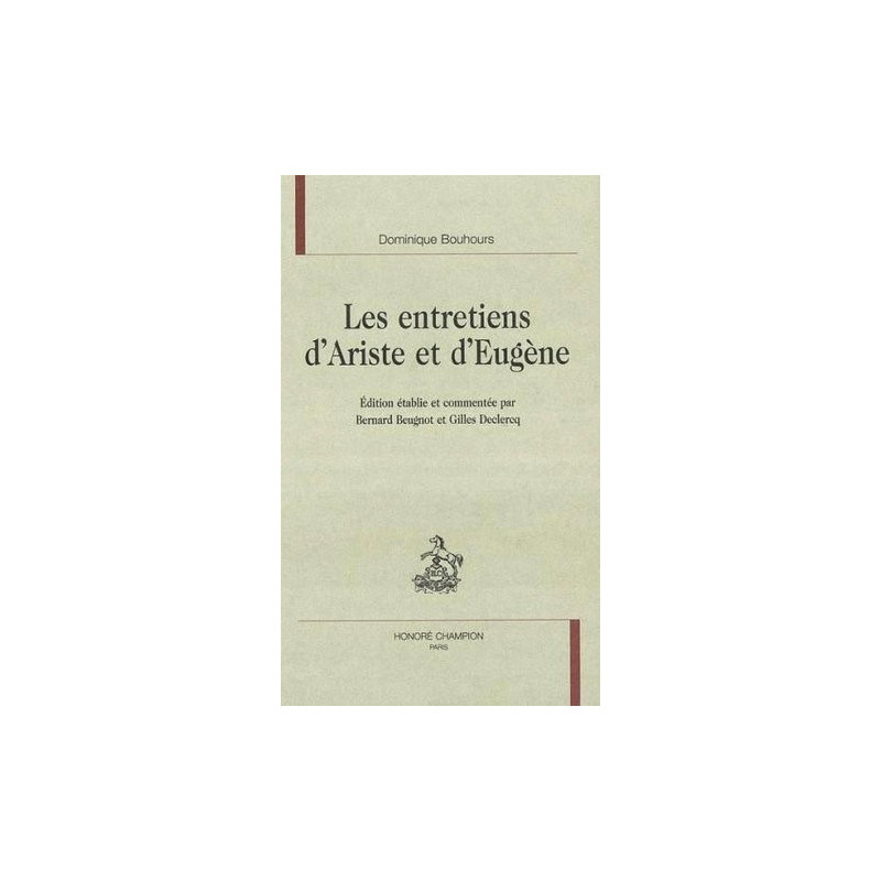 Polygraphe dont les ouvrages, souvent oubliés, embrassent la grammaire et la lexicologie, la biographie et l'esthétique, la polémique et la religion, le P. Bouhours (1628-1703, entré dans la Compagnie de Jésus en 1644) demeure en retrait du renouveau des études dix-septièmistes. Ses Entretiens d'Ariste et d'Eugène, bien qu'ils aient connu plus de vingt éditions de 1671 au milieu du XVIIIe siècle, n'ont jamais reçu de la critique le regard attentif que leur méritaient leur forme, leur contenu et leur statut. Il fallait donc, pour restituer à cette gravure son grain originel, à la fois retrouver le considérable substrat livresque sur lequel repose l'insolite éventail des sujets (La Mer, La Langue française, Le secret, Le bel-esprit, Le je ne sais quoi, Les devises) et mettre en évidence tout l'appareil conceptuel qu'il orchestre autour des notions de naturel, de grâce, de gaieté, de badinage dans le cadre privilégié d'une conversation mondaine, selon le modèle élaboré et mis en œuvre par Guez de Balzac, le chevalier de Méré, Madeleine de Scudéry. Tout nourris de culture ancienne et de culture contemporaine, à la dimension de l'Europe profondément ancrés dans la rhétorique et l'esthétique du XVIIe siècle, ces Entretiens, en communauté d'inspiration avec Les Amours de Psyché et de Cupidon (1669) de La Fontaine, sont un des textes les plus représentatifs et à plusieurs égards fondateurs du classicisme de 1660.