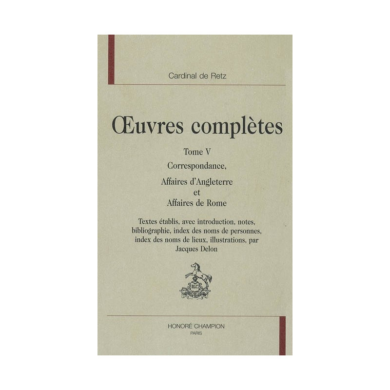 Le tome V des Œuvres Complètes de Retz se rapporte à sa Correspondance sur les Affaires d'Angleterre et sur les Affaires de Rome. Pendant son exil, le Cardinal conseilla secrètement Charles II, lui promettant l'appui du pape pour l'aider à recouvrer son trône puis rétablir le catholicisme en Angleterre. De son accommodement avec Louis XIV et de ses missions diplomatiques auprès du Saint-Siège, résultent d'abondants échanges épistolaires sur divers sujets : litiges politiques et religieux, querelles doctrinales, conclaves ; ou démarches plus personnelles : projet de démission du cardinalat, interventions au côté de Rancé pour la réforme de Cîteaux, prises de position sur la Régale et le Formulaire. À l'image de l'ancien Frondeur se substitue celle d'un diplomate avisé, au talent d'écriture incomparable : perspective nouvelle, susceptible de renouveler considérablement l'approche de la vie, de l'œuvre, et de la personnalité de Retz.
