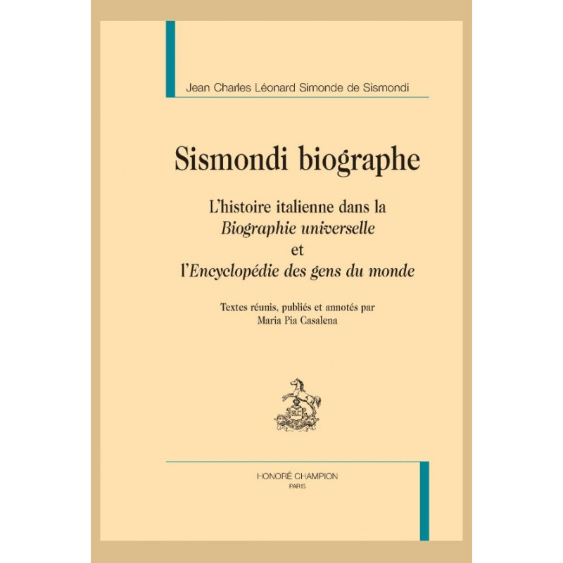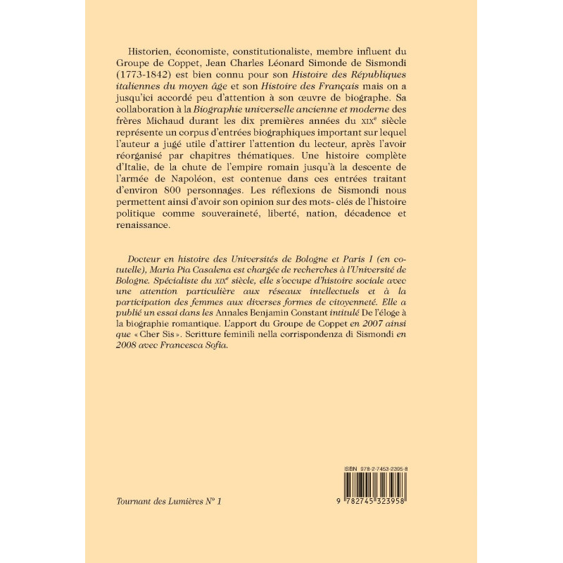 This study focuses on Jean Charles Léonard Simonde de Sismondi, notably on his work as a biographer. It looks at his contributions to the Biographie universelle ancienne et moderne of the Michaud brothers. The author shows that Sismondi’s entries reveal the entire history of Italy, from the fall of the Roman Empire to the fall of Napoleon. Sismondi’s commentaries also give a personal insight into notions like sovereignty, liberty, nation, Decadence and Renaissance.