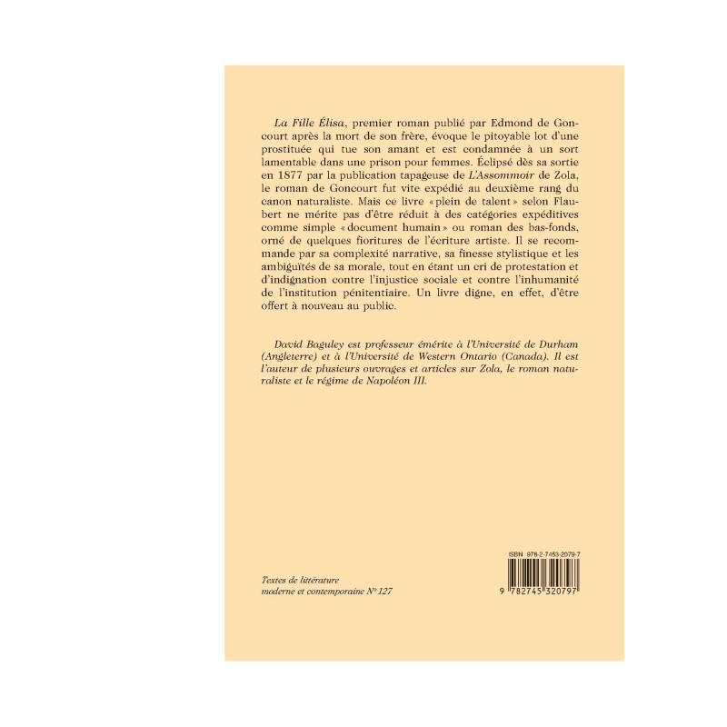 La Fille Élisa, premier roman publié par Edmond de Goncourt après la mort de son frère, évoque le pitoyable lot d`une prostituée qui tue son amant et est condamnée à un sort lamentable dans une prison pour femmes. Éclipsé dès sa sortie en 1877 par la publication tapageuse de L`Assommoir de Zola, le roman de Goncourt fut vite expédié au deuxième rang du canon naturaliste. Mais ce livre " plein de talent " selon Flaubert ne mérite pas d`être réduit à des catégories expéditives comme simple " document humain" ou roman des bas-fonds, orné de quelques fioritures de l`écriture artiste. Il se recommande par sa complexité narrative, sa finesse stylistique et les ambiguïtés de sa morale, tout en étant un cri de protestation et d`indignation contre l`injustice sociale et contre l`inhumanité de l`institution pénitentiaire. Un livre digne, en effet, d`être offert à nouveau au public.