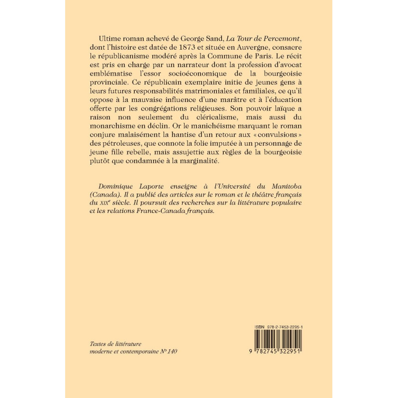 Ultime roman achevé de George Sand, « La Tour de Percemont », dont l’histoire est datée de 1873 et située en Auvergne, consacre le républicanisme modéré après la Commune de Paris. Le récit est pris en charge par un narrateur dont la profession d’avocat emblématise l’essor socioéconomique de la bourgeoisie provinciale. Ce républicain exemplaire initie de jeunes gens à leurs futures responsabilités matrimoniales et familiales, qu’il oppose à la mauvaise influence d’une marâtre et à l’éducation offerte par les congrégations religieuses. Son pouvoir laïque a raison non seulement du cléricalisme, mais aussi du monarchisme en déclin. Or le manichéisme marquant le roman conjure malaisément la hantise d’un retour aux « convulsions » des pétroleuses, que connote la folie imputée à un personnage de jeune fille rebelle, mais assujettie aux règles de la bourgeoisie plutôt que condamnée à la marginalité.