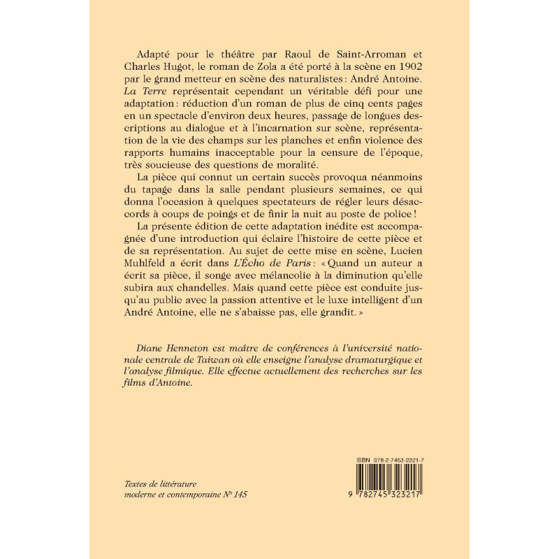 At the centre of this study is André Antoine’s 1902 stage adaptation of Zola‘s novel La Terre. It focuses, amongst other things, on the difficulties of reducing more than five hundred pages to a two-hour stage performance, the representation of long passages of dialogues or violence, inacceptable in regard to censorship of the time. The present edition of the unpublished adaptation includes an introduction on the history of the play and its representation.