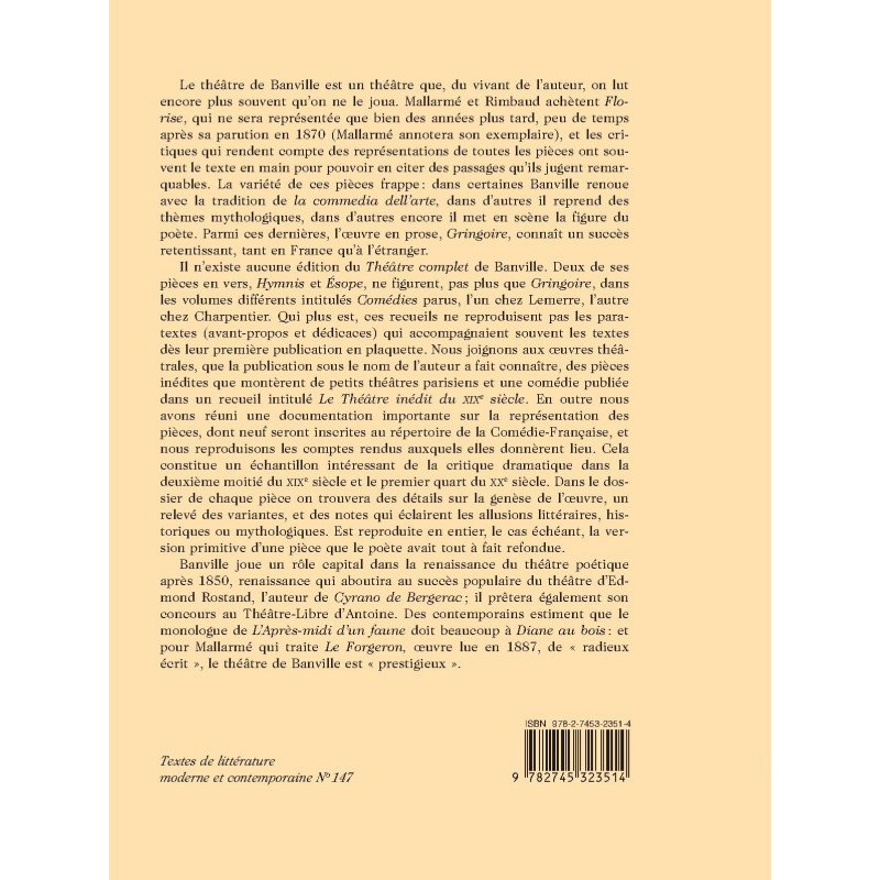 This edition includes the entire repertoire of theatre plays of 19th century French poet and writer Theodore de Banville. The plays are varied; some are associated with the Commedia dell’arte, others deal with themes of the domain of mythology and in others he focuses on the figure of the poet. This edition also includes yet unpublished plays, important documentation on the plays, details on the origins of the plays, as well as variants and notes.