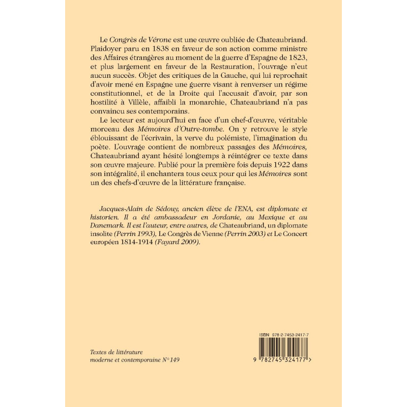 In this largely forgotten opus, criticized by both the Left and the Right, Chateaubriand defends the Bourbon Restoration and his own tenure as Foreign Affairs Secretary during the Spanish expedition of 1823. It displays all of the writer’s mesmerizing style, the polemicist’s verve and the poet’s imagination.