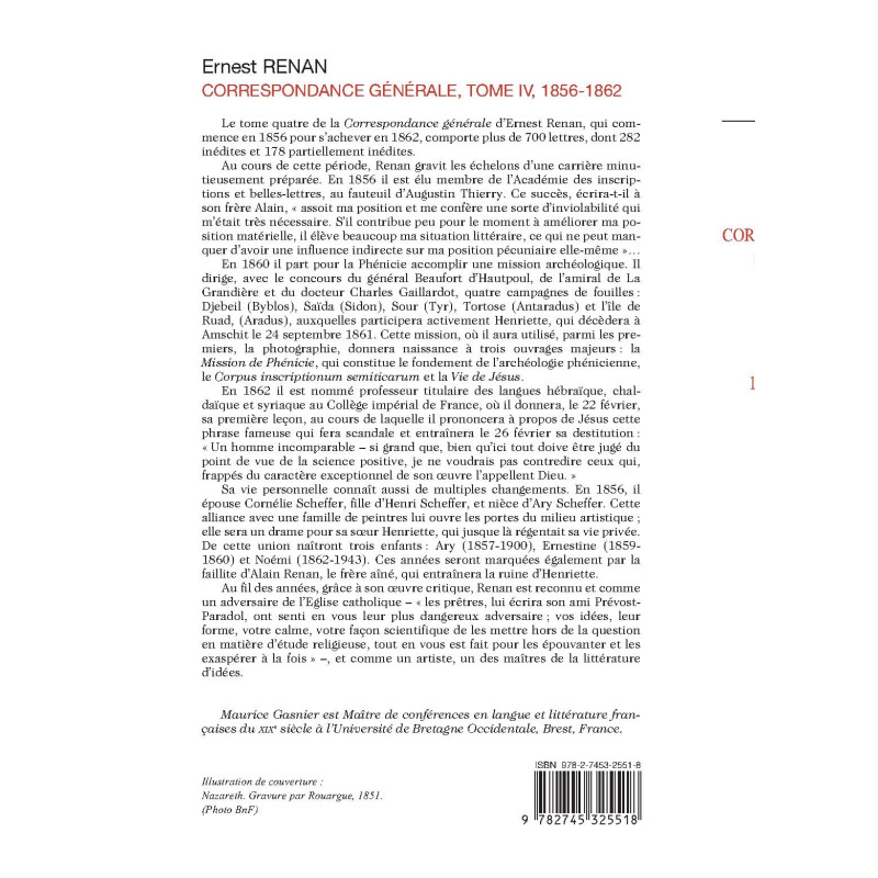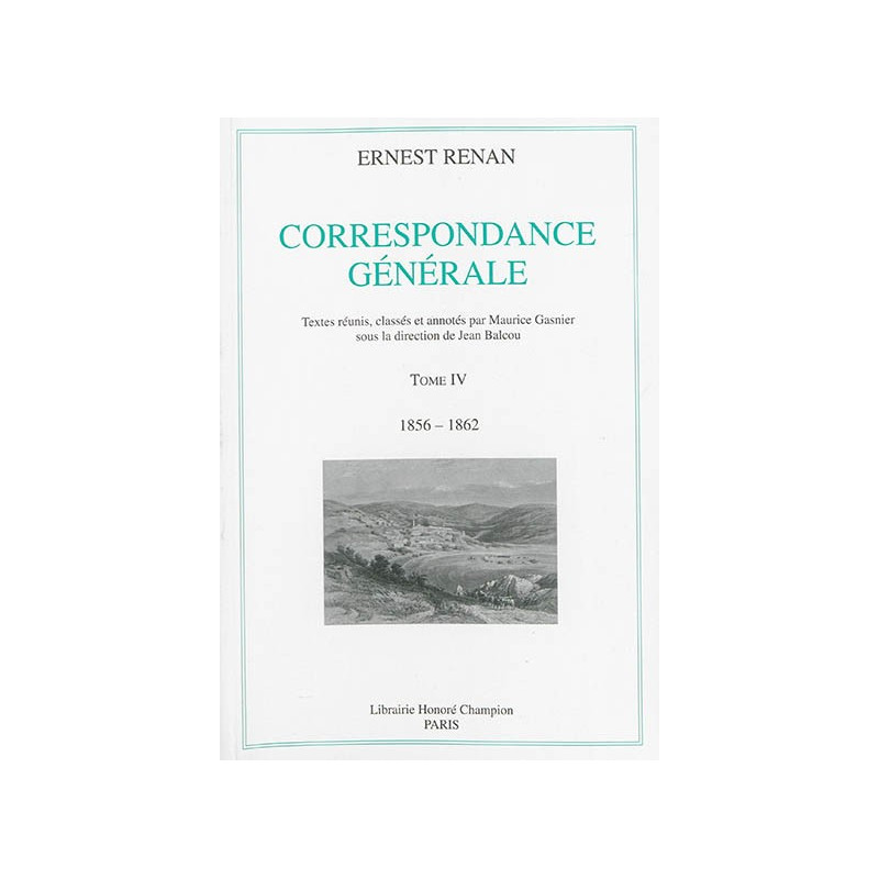 Tome IV of Ernest Renan’s correspondence compiles all surviving letters (over 700 of them, more than 400 of which were hitherto unpublished in whole or in part) exchanged between 1856 and 1862 by the writer with his mother, brother, sister and wife (as well as letters these family members exchanged with each other).