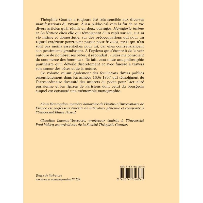 Ménagerie intime and La Nature chez elle evidence the poet’s recentering on his intimate, domestic life whilst discreetly expounding a pantheist philosophy. This volume also gathers various smaller pieces (including a memorable monograph on the Parisian bourgeois) that testify to the breadth of Gautier’s interests.