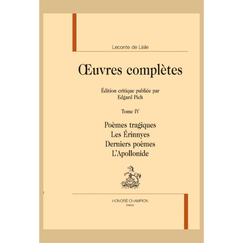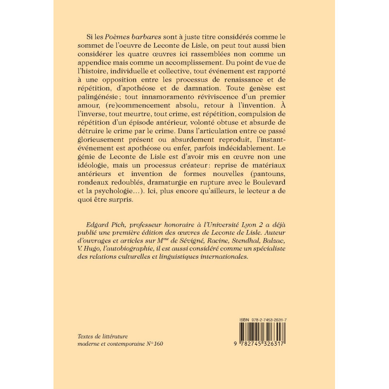 sommet de l’oeuvre de Leconte de Lisle, on peut tout aussi bien considérer les quatre oeuvres ici rassemblées non comme un appendice mais comme un accomplissement. Du point de vue de l’histoire, individuelle et collective, tout événement est rapporté à une opposition entre les processus de renaissance et de répétition, d’apothéose et de damnation. Toute genèse est palingénésie ; tout innamoramento réviviscence d’un premier amour, (re)commencement absolu, retour à l’invention. À l’inverse, tout meurtre, tout crime, est répétition, compulsion de répétition d’un épisode antérieur, volonté obtuse et absurde de détruire le crime par le crime. Dans l’articulation entre ce passé glorieusement présent ou absurdement reproduit, l’instantévénement est apothéose ou enfer, parfois indécidablement. Le génie de Leconte de Lisle est d’avoir mis en oeuvre non une idéologie, mais un processus créateur : reprise de matériaux antérieurs et invention de formes nouvelles (pantouns, rondeaux redoublés, dramaturgie en rupture avec le Boulevard et la psychologie…). Ici, plus encore qu’ailleurs, le lecteur a de quoi être surpris.