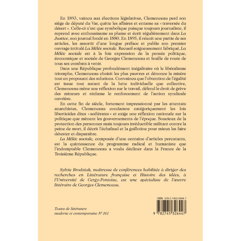 La Mêlée sociale, composée d’une centaine d’articles percutants, est la quintessence du programme radical et humaniste que l’indomptable Clemenceau a voulu décliner dans la France de la Troisième République.