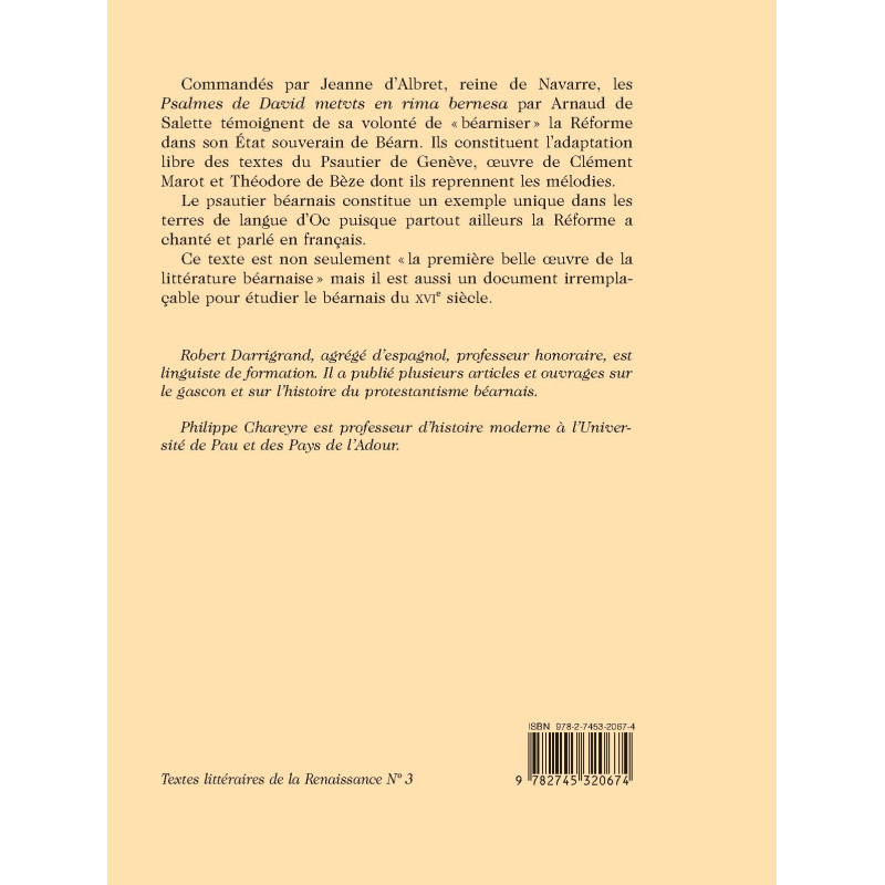 Commandés par Jeanne d'Albret, reine de Navarre, les Psalmes de David metvts en rima bernesa par Arnaud de Salette témoignent de sa volonté de "béarniser" la Réforme dans son État souverain de Béarn. Ils constituent l'adaptation libre des textes du Psautier de Genève, œuvre de Clément Marot et Théodore de Bèze dont ils reprennent les mélodies. Le psautier béarnais constitue un exemple unique dans les terres de langue d'Oc puisque partout ailleurs la Réforme a chanté et parlé en français. Ce texte est non seulement "la première belle œuvre de la littérature béarnaise" mais il est aussi un document irremplaçable pour étudier le béarnais du XVIe siècle.
