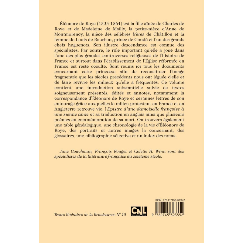 This study looks at Eléonore de Roye (1535-1564), princess of Condé. It also mentions the important role she has played in one of the biggest religious controversies of the history of France and most importantly the establishment of the Reformed Church in France.