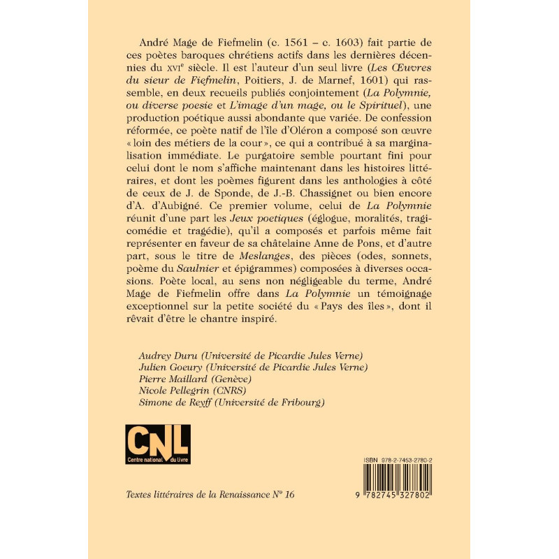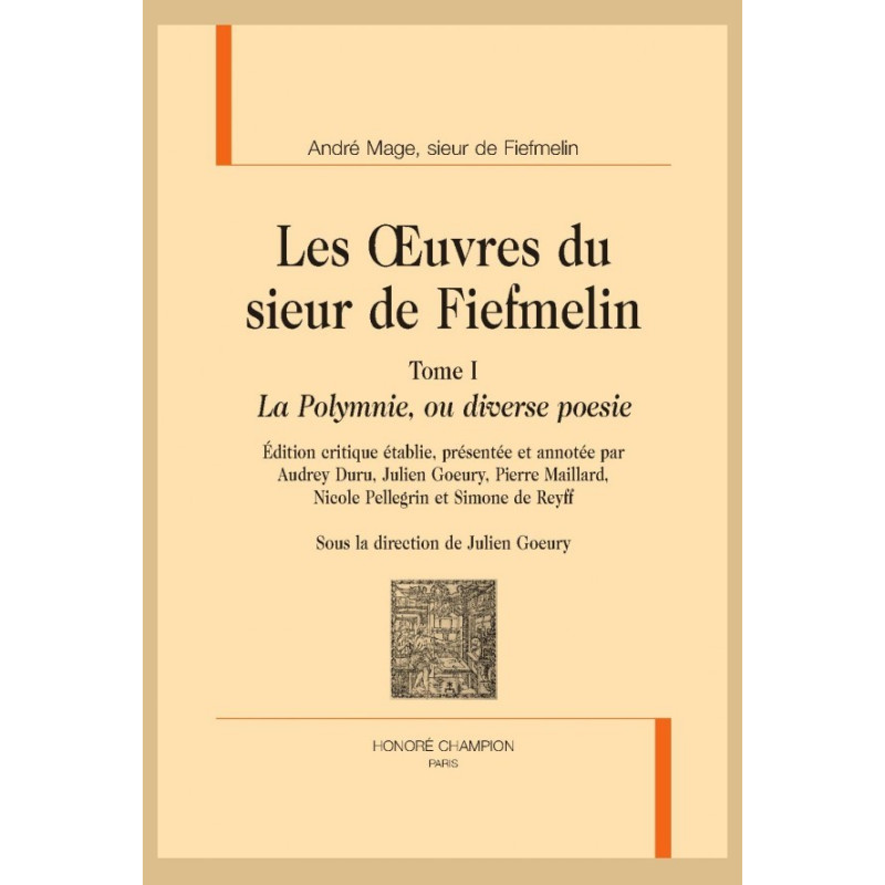 André Mage de Fiefmelin was a long-forgotten, recently rediscovered baroque poet from the late 16th century. In spite of an abundant and varied output, he published a mere two collections (in 1601). This tome is a critical edition of the first of these, entitled La Polymnie, ou diverse poesie.