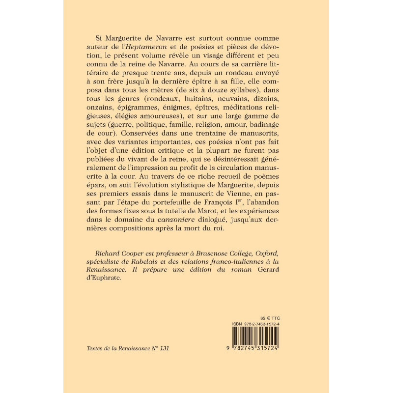 Au cours de sa carrière littéraire de presque trente ans, depuis un rondeau envoyé à son frère jusqu'à la dernière épître à sa fille, Marguerite de Navarre composa dans tous les mètres (de six à douze syllabes), dans tous les genres (rondeaux, huitains, neuvains, dizains, onzains, épigrammes, énigmes, épîtres, méditations religieuses, élégies amoureuses), et sur une large gamme de sujets (guerre, politique, famille, religion, amour, badinages de cour). Au travers de ce riche recueil de poèmes épars qui n'avaient jamais fait l'objet d'une édition critique, on suit l'évolution stylistique de Marguerite, depuis ses premiers essais dans le manuscrit de Vienne, en passant par l'étape du portefeuille de François Ier, l'abandon des formes fixes sous la tutelle de Marot, et les expériences dans le domaine du canzionere dialogué, jusqu'aux dernières compositions après la mort du roi.