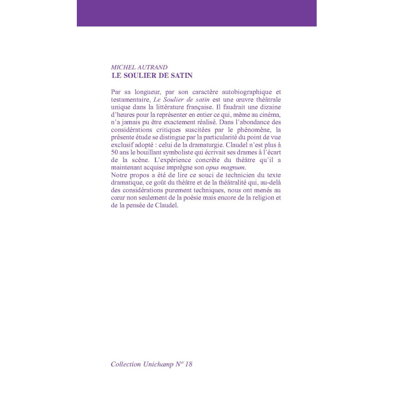 Par sa longueur, par son caractère autobiographique et testamentaire, Le Soulier de satin est une œuvre théâtrale unique dans la littérature française. Il faudrait une dizaine d’heures pour la représenter en entier ce qui, même au cinéma, n’a jamais pu être exactement réalisé. Dans l’abondance des considérations critiques suscitées par le phénomène, la présente étude se distingue par la particularité du point de vue exclusif adopté : celui de la dramaturgie. Claudel n’est plus à 50 ans le bouillant symboliste qui écrivait ses drames à l’écart de la scène. L’expérience concrète du théâtre qu’il a maintenant acquise imprègne son opus magnum.