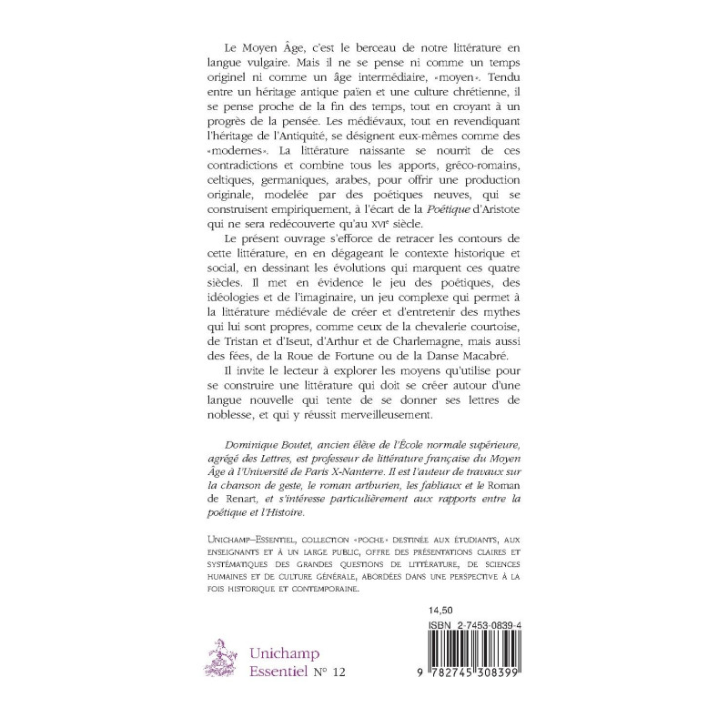 Le présent ouvrage s`efforce de retracer les contours de cette littérature, en en dégageant le contexte historique et social, en dessinant les évolutions qui marquent ces quatre siècles. Il met en évidence le jeu des poétiques, des idéologies et de l`imaginaire, un jeu complexe qui permet à la littérature médiévale de créer et d`entretenir des mythes qui lui sont propres, comme ceux de la chevalerie courtoise , de Tristan et d`Iseut, d`Arthur et de Charlemagne, mais aussi des fées, de la Roue de Fortune ou de la Danse Macabré.
