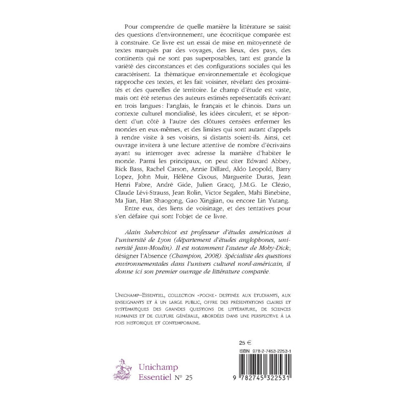 This essay focuses on the way literature treats environmental questions. It looks at how journeys, places, countries and continents are represented in literature. Amongst others, the works of the following authors are considered: Edward Abbey, Rick Bass, Rachel Carson, Annie Dillard, Aldo Leopold, Barry Lopez, John Muir, Hélène Cixous, Marguerite Duras, Jean Henri Fabre, André Gide, Julien Gracq, J. M. G. Le Clézio, Claude Lévi-Strauss, Jean Rolin, Victor Segalen, Mahi Binebine, Ma Jian, Han Shaogong, Gao Xingjian and Lin Yutang.