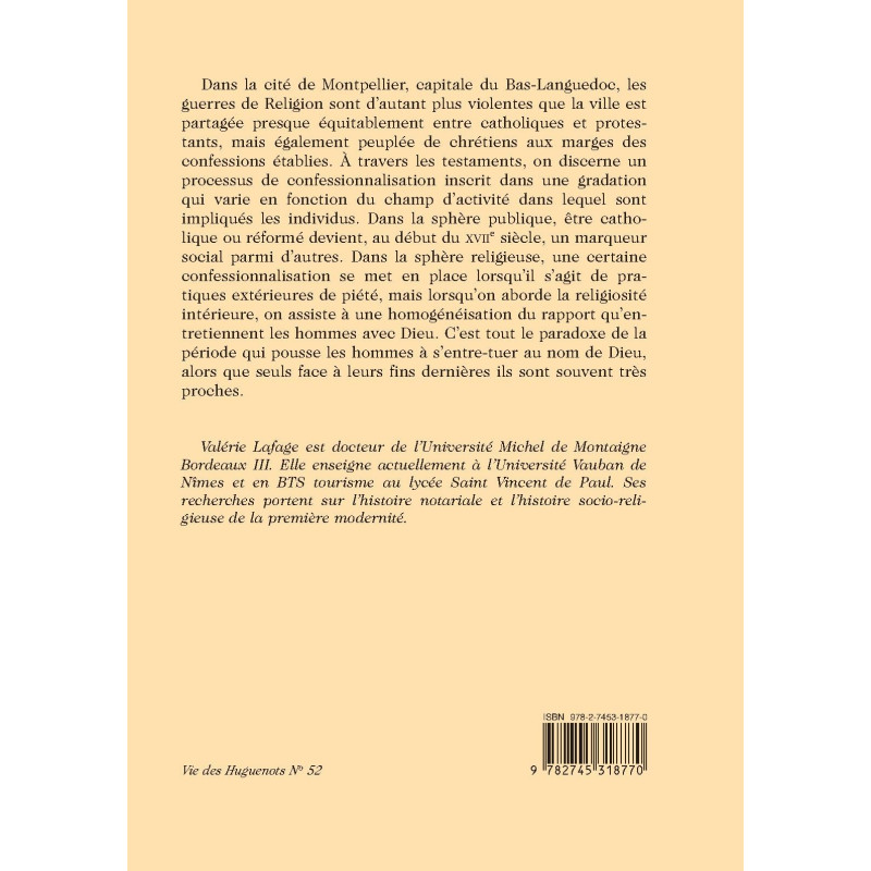 Dans la cité de Montpellier, capitale du Bas-Languedoc, les guerres de Religion sont d'autant plus violentes que la ville est partagée presque équitablement entre catholiques et protestants, mais également peuplée de chrétiens aux marges des confessions établies. À travers les testaments, on discerne un processus de confessionnalisation inscrit dans une gradation qui varie en fonction du champ d'activité dans lequel sont impliqués les individus. Dans la sphère publique, être catholique ou réformé devient, au début du XVIIe siècle, un marqueur social parmi d'autres. Dans la sphère religieuse, une certaine confessionnalisation se met en place lorsqu'il s'agit de pratiques extérieures de piété, mais lorsqu'on aborde la religiosité intérieure, on assiste à une homogénéisation du rapport qu'entretiennent les hommes avec Dieu. C'est tout le paradoxe de la période qui pousse les hommes à s'entretuer an nom de Dieu, alors que seuls face à leurs fins dernières ils sont souvent très proches.