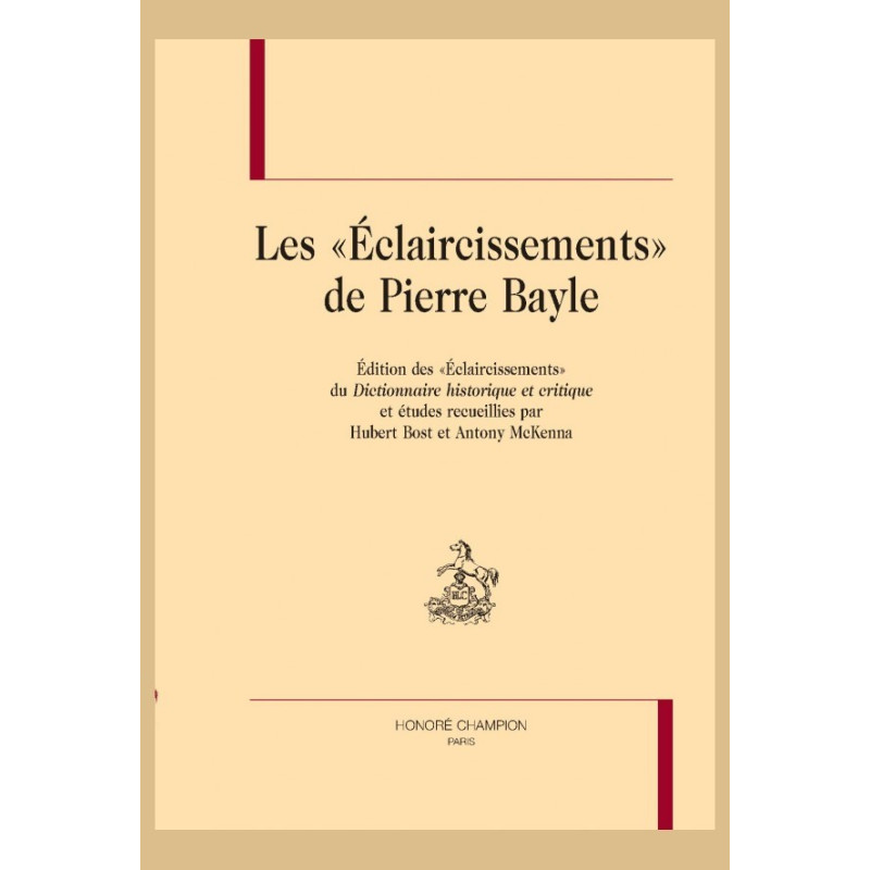 Dans les Éclaircissements publiés en appendice à la deuxième édition de son Dictionnaire historique et critique en 1702, Bayle se défend contre les accusations lancées par le consistoire de l'Église wallonne de Rotterdam, rappelle l'esprit dans lequel il a conçu son Dictionnaire et propose quatre développements : Éclaircissement sur les athées, Éclaircissement sur les manichéens, Éclaircissement sur les pyrrhoniens, Éclaircissement sur les obscénités. Cet ensemble de remarques justificatives - près de quarante pages in folio, dont on trouvera ici la première édition moderne complète - constitue un corpus dont l'interprétation est déterminante pour la compréhension de la pensée de Bayle.