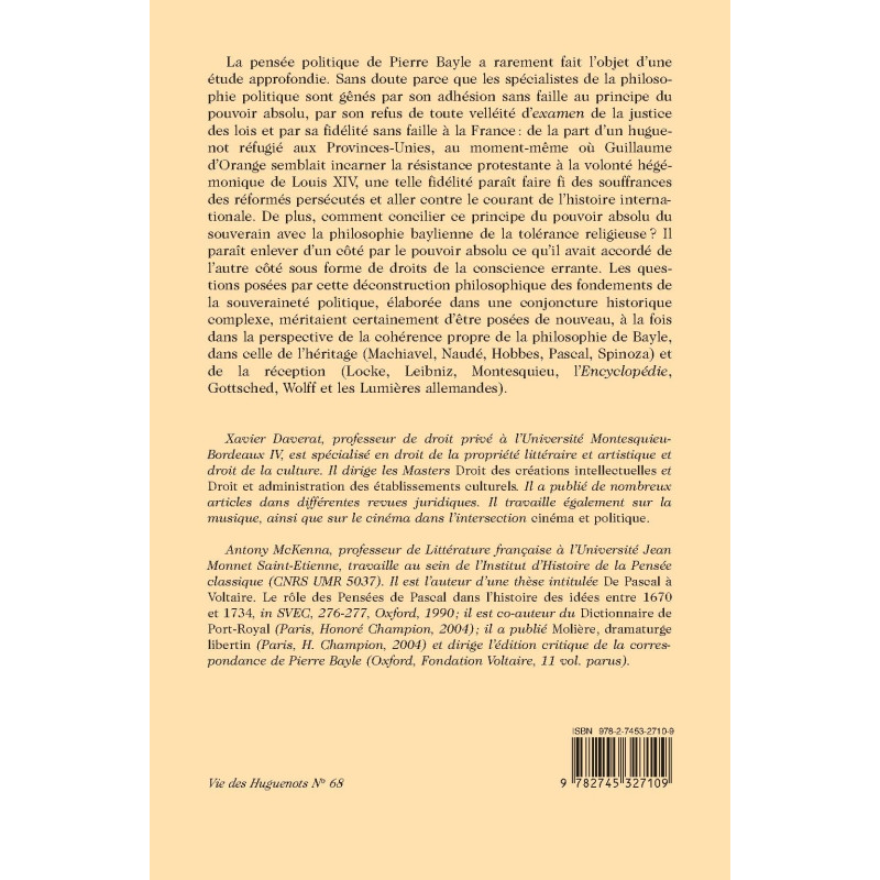 La pensée politique de Pierre Bayle a rarement fait l’objet d’une étude approfondie. Sans doute parce que les spécialistes de la philosophie politique sont gênés par son adhésion sans faille au principe du pouvoir absolu, par son refus de toute velléité d’examen de la justice des lois et par sa fidélité sans faille à la France : de la part d’un huguenot réfugié aux Provinces-Unies, au moment-même où Guillaume d’Orange semblait incarner la résistance protestante à la volonté hégémonique de Louis XIV, une telle fidélité paraît faire fi des souffrances des réformés persécutés et aller contre le courant de l’histoire internationale. De plus, comment concilier ce principe du pouvoir absolu du souverain avec la philosophie baylienne de la tolérance religieuse ? Il paraît enlever d’un côté par le pouvoir absolu ce qu’il avait accordé de l’autre côté sous forme de droits de la conscience errante. Les questions