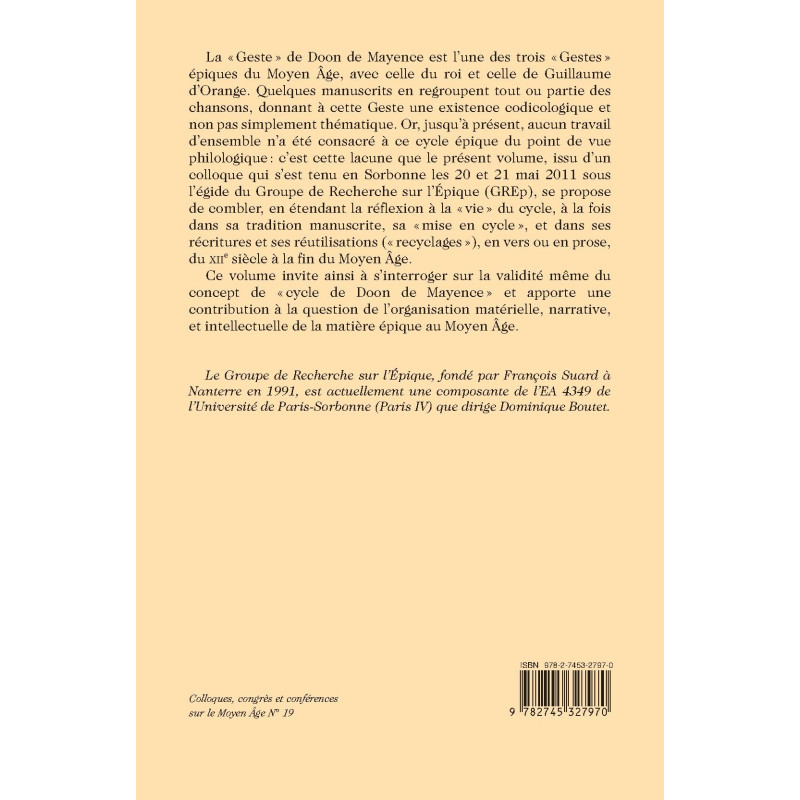 This collection is the first comprehensive philological and codicological study of the geste of Doon de Mayence. It looks at the whole “life cycle” of these medieval epic tales, from the earliest manuscripts to their rewritings and “recyclings”, in prose and in verse, into the late Middle Ages.