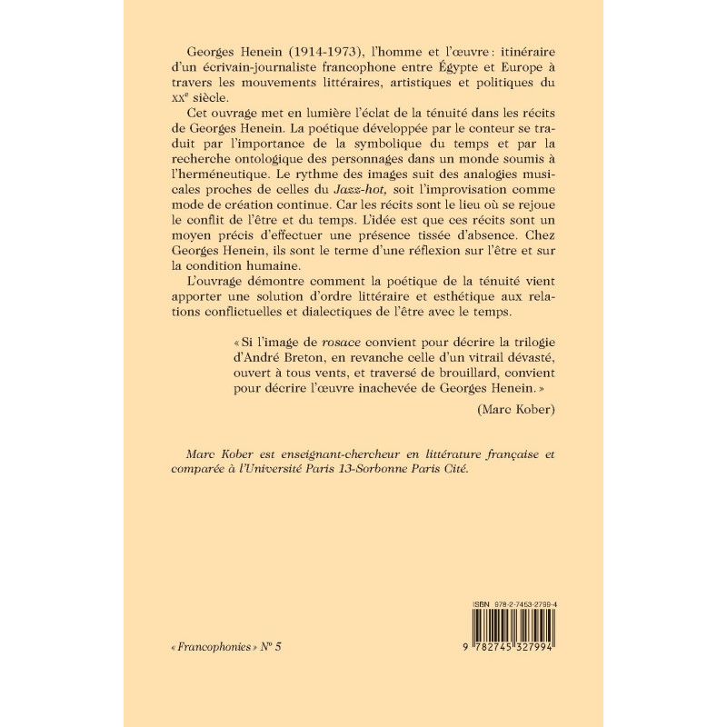 l’herméneutique. Le rythme des images suit des analogies musicales proches de celles du Jazz-hot, soit l’improvisation comme mode de création continue. Car les récits sont le lieu où se rejoue le conflit de l’être et du temps. L’idée est que ces récits sont un moyen précis d’effectuer une présence tissée d’absence. Chez Georges Henein, ils sont le terme d’une réflexion sur l’être et sur la condition humaine.