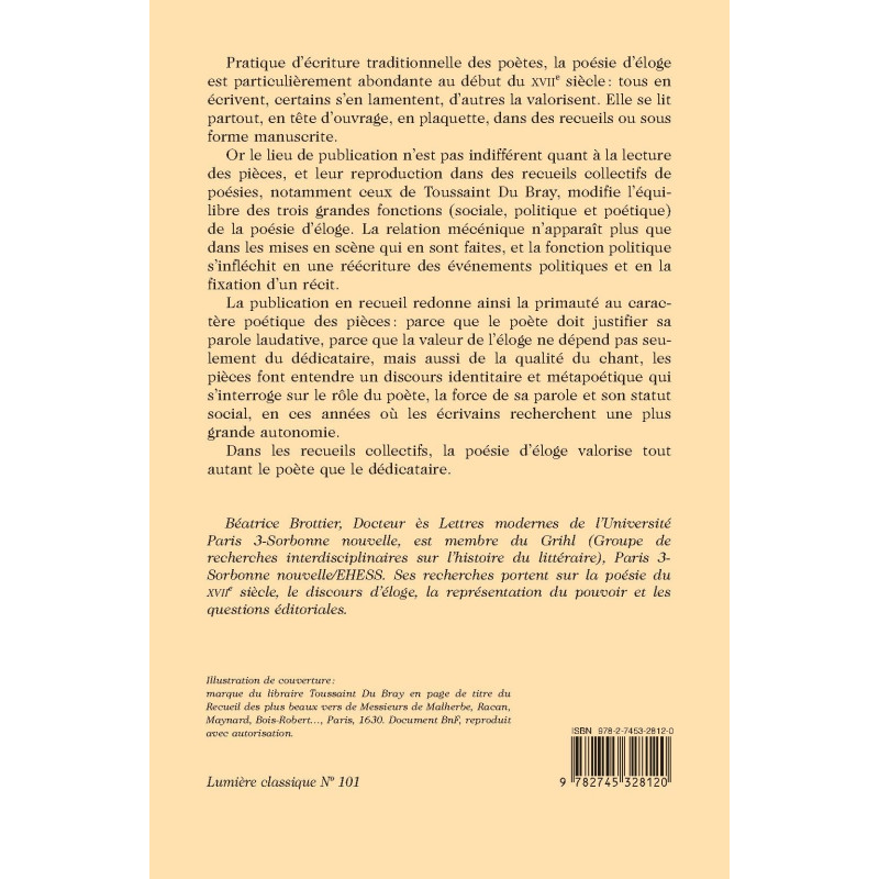 The poetry of praise, a traditional practice, was particularly abundant in the early 17th century. The balance of its 3 functions (social, political and poetic) was upset when published in collections, such as those by Toussaint Du Bray: in this context, poems were as much in the poet’s honor as in the dedicatee’s.