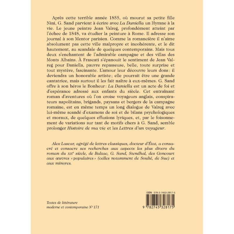 Written shortly after the 1855 death of Sand’s granddaughter Nini, La Daniella is an ode to life, a declaration of hope and faith. It is also a captivating adventure tale, and a sustained inner dialogue undertaken by a protagonist given to moral and psychological self-analaysis, and the occasional lyrical flight.