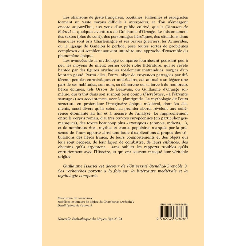 Les chansons de geste françaises, occitanes, italiennes et espagnoles forment un vaste corpus difficile à interpréter, et d’où n’émergent encore aujourd’hui, aux yeux d’un public cultivé, que la Chanson de Roland et quelques aventures de Guillaume d’Orange. Le foisonnement des textes (plus de cent), des personnages héroïques, des situations dans lesquelles sont pris Charlemagne et ses braves guerriers, les Aymerides, ou le lignage de Ganelon le perfide, pose toutes sortes de problèmes complexes qui semblent souvent interdire une approche d’ensemble du phénomène épique. Les avancées de la mythologie comparée fournissent pourtant peu à peu les moyens de mieux cerner cette riche littérature, qui se révèle hantée par des figures mythiques totalement inattendues, surgies d’un lointain passé. Parmi elles, l’ours ; objet de croyances partagées par différents peuples eurasiatiques et américains, cet animal a su léguer une part de ses habitudes, son nom, sa démarche ou sa force à de nombreux héros épiques, tels Orson de Beauvais, ou Guillaume d’Orange soi-même, qui trahit dans son surnom bien connu (Fierebrace, « à l’étreinte sauvage ») ses accointances avec le plantigrade. La mythologie de l’ours structure en profondeur l’imaginaire épique médiéval, dont les éléments, aussi divers qu’ils soient au premier abord, révèlent une cohérence étonnante au fur et à mesure de l’analyse. Le rapprochement entre le corpus roman, d’autres oeuvres européennes (en particulier germaniques), des textes beaucoup plus « exotiques » (chinois, indiens,…), et de nombreux rites, mythes et contes populaires marqués par la présence de l’ours apporte ainsi une foule d’explications à propos des tribulations des héros francs, de leurs comportements et des objets qui leur sont propres, de leur façon de combattre, de leurs enfances, des chemins qu’ils arpentent… sans oublier les rapports troubles qu’ils entretiennent avec l’Histoire, et qui ont souvent masqué leur véritable origine.