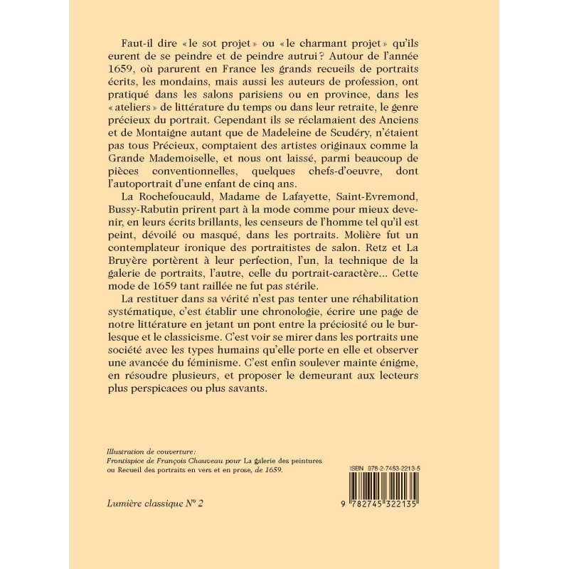Autour de l’année 1659, où parurent en France les grands recueils de portraits écrits, les mondains, mais aussi les auteurs de profession, ont pratiqué dans les salons parisiens ou en province, dans les « ateliers » de littérature du temps ou dans leur retraite, le genre précieux du portrait. Cependant ils se réclamaient des Anciens et de Montaigne autant que de Madeleine de Scudéry, et n’étaient pas tous Précieux.