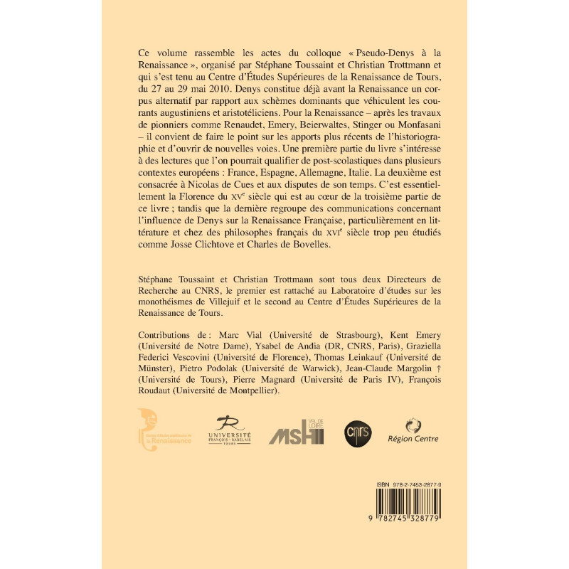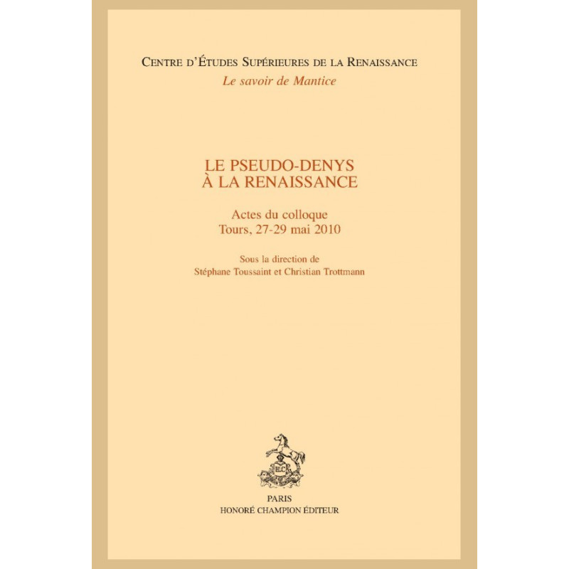 Ce volume rassemble les actes du colloque « Pseudo-Denys à la Renaissance », organisé par Stéphane Toussaint et Christian Trottmann et qui s’est tenu au Centre d’Études Supérieures de la Renaissance de Tours, du 27 au 29 mai 2010. Denys constitue déjà avant la Renaissance un corpus alternatif par rapport aux schèmes dominants que véhiculent les courants