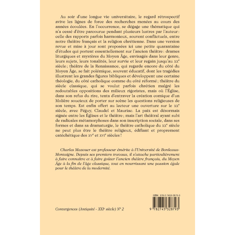 The 40-odd studies revised for this volume explore the sometimes harmonious, often contentious relationship between French theatre and Christianity. Most focus on rather ancient works, from the Middle Ages to the era of classicism, but the 20th century is glimpsed at through the works of Péguy, Claudel and Mauriac.