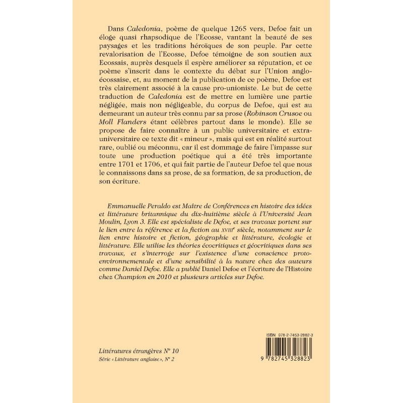 This annotated bilingual edition of Defoe’s 1,265-line ode to Scotland, Caledonia, stems from the conviction that he has been unduly spurned by anthologies of poetry. Besides praising the country’s landscape and its people, the poem hints between the lines at Defoe’s support for union with England.