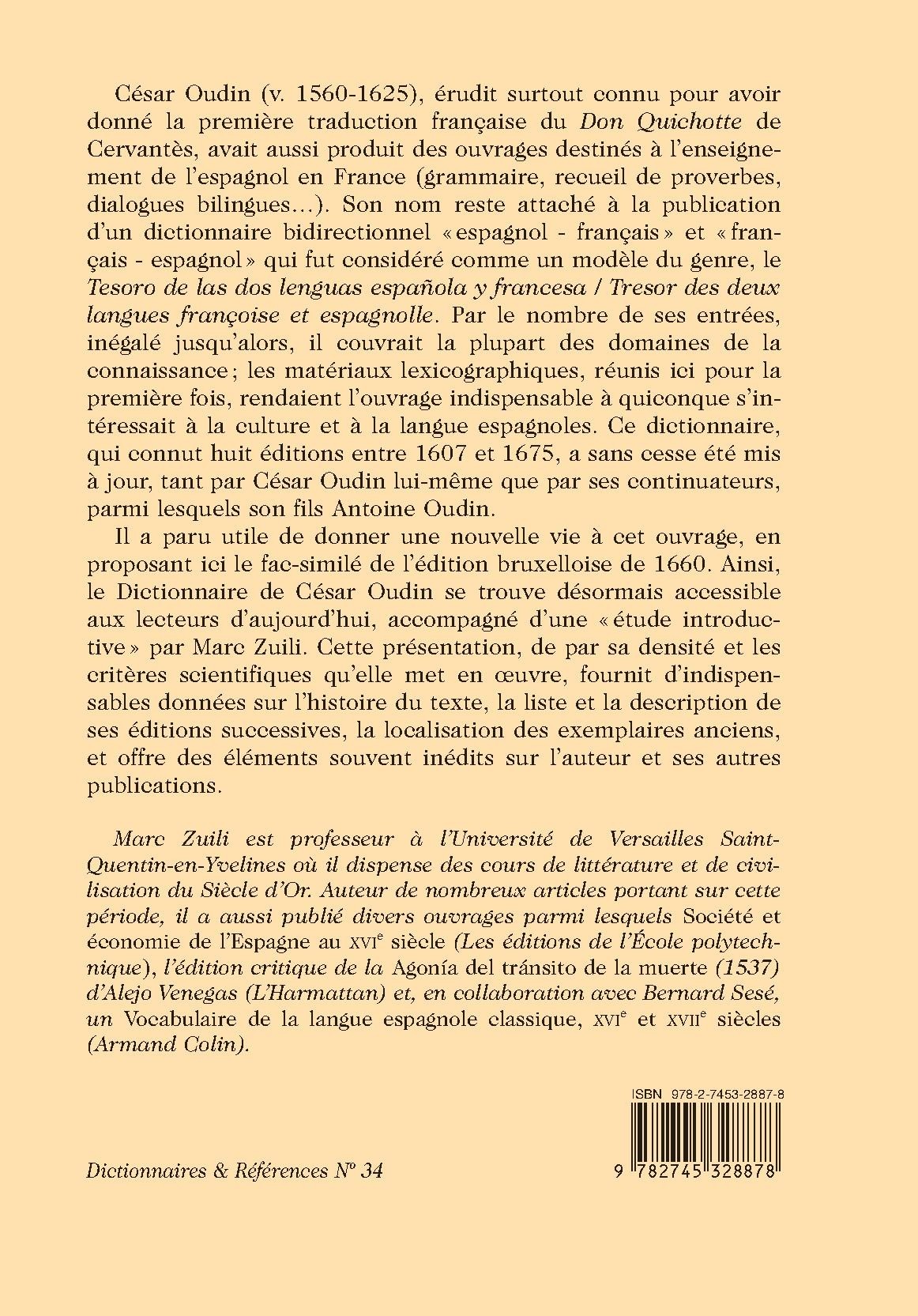 César Oudin (ca. 1560-1625), in addition to the earliest French translation of Cervantes’s Don Quixote, authored a landmark bilingual French-Spanish dictionary of unparalleled breadth and lexical wealth. This is a facsimile of the 1660 Brussels edition, complemented by an extensive introduction.