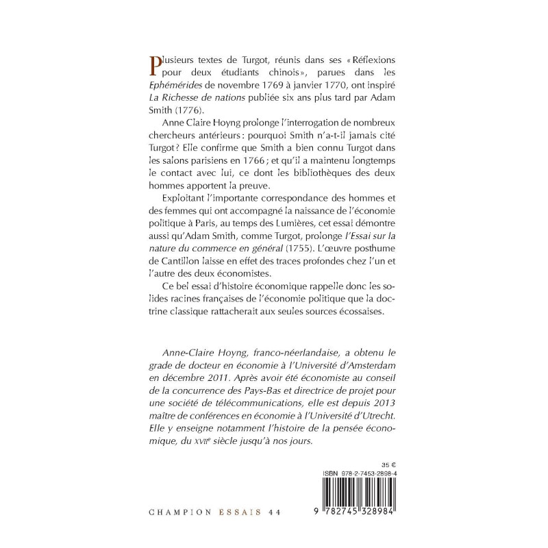 The Wealth of Nations (1776) was clearly inspired by earlier texts published by the French economist Turgot, although Smith never mentions him. This essay confirms that the two men knew each other well, and demonstrates that Smith is also indebted to Cantillon, emphasizing the French roots of political economy.