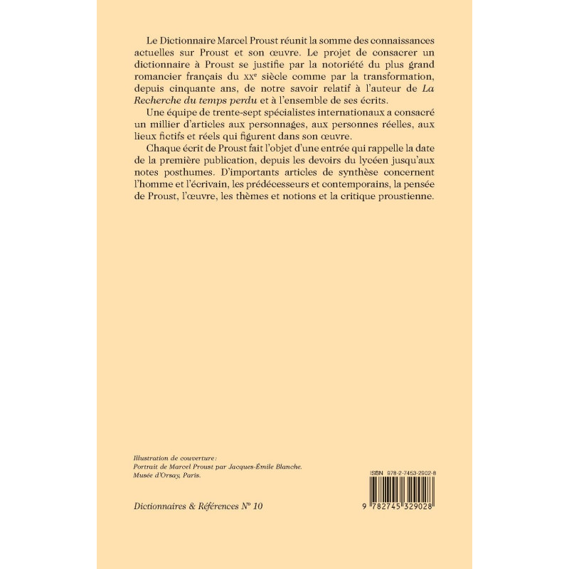 Le Dictionnaire Marcel Proust réunit la somme des connaissances actuelles sur Proust et son œuvre. Le projet de consacrer un dictionnaire à Proust se justifie par la notoriété du plus grand romancier français du XXe siècle comme par la transformation, depuis cinquante ans, de notre savoir relatif à l’auteur de La Recherche du temps perdu et à l’ensemble de ses écrits. Une équipe de trente-sept spécialistes internationaux a consacré un millier d’articles aux personnages, aux personnes réelles, aux lieux fictifs et réels qui figurent dans son œuvre. Chaque écrit de Proust fait l’objet d’une entrée qui rappelle la date de la première publication, depuis les devoirs du lycéen jusqu’aux notes posthumes. D’importants articles de synthèse concernent l’homme et l’écrivain, les prédécesseurs et contemporains, la pensée de Proust, l’œuvre, les thèmes et notions et la critique proustienne.