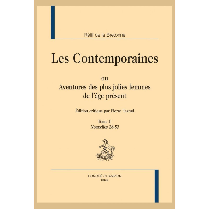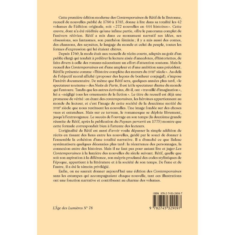 Cette première édition moderne des Contemporaines de Rétif de la Bretonne, recueil de nouvelles publié de 1780 à 1785, donne à lire dans sa totalité les 42 volumes de l’édition originale, soit « 272 nouvelles en 444 histoires ». Cette