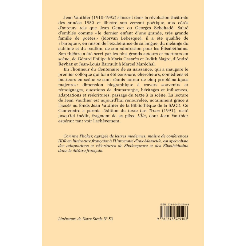 To celebrate the centenary of the birth of Jean Vauthier, an exemplar of the poetic facet of the 1950s theatrical revolution, this conference brought together scholars, actors and directors around 5 main themes: biography, dramaturgy, legacy and influences, adaptations and rewrites, and transition from page to stage.