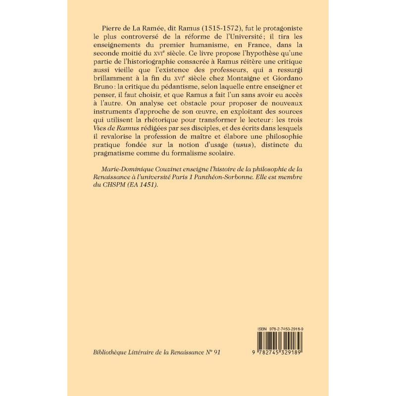 This study analyzes the links between philosophy, humanism and scholarly culture according to Ramus, the great 16th-century pedagogue – a prime target of the so-called “critique of pedantry”, which asserted that one had to choose between teaching and thinking. It offers new critical tools to approach his oeuvre.