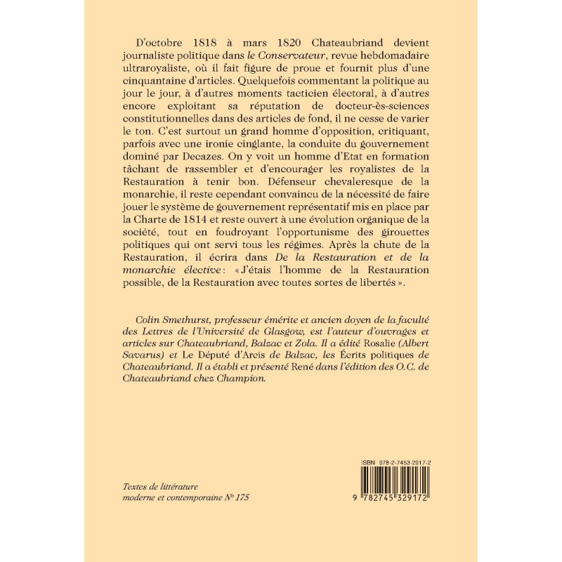 From October 1818 to March 1820, Chateaubriand became a figurehead of sorts for Le Conservateur, an ultra-royalist weekly, contributing about fifty articles – commenting on day-to-day politics, offering electoral advice, acerbically criticizing the government and making use of his reputed constitutional expertise.