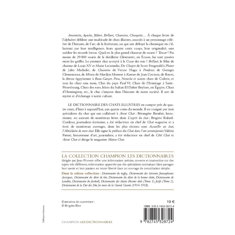 LE DICTIONNAIRE DES CHATS ILLUSTRES en compte près de quatre cents, d’hier à aujourd’hui, aux quatre coins du monde. Il est cosigné par trois spécialistes du chat qui ont collaboré à Atout Chat : Bérangère Bienfait, historienne, auteure de nombreux livres dont « L’esprit du chat » ; Brigitte Bulard-Cordeau, journaliste-écrivaine, a été rédactrice en chef de Chat magazine et a écrit de nombreux ouvrages, dont les plus récents sont Le Petit livre des chats, Chêne, Les plus belles races de chat, Accueillir un chat (2014), Larousse, etc., l’Abécédaire du chat, Chêne (2014). Elle signe la préface de « Le chat dans l’art contemporain » (2013 (Abbate-Piolé). Valérie Parent, historienne d’art, journaliste, a été rédactrice en chef de Côté Chat et a dirigé le magazine Atout Chat.