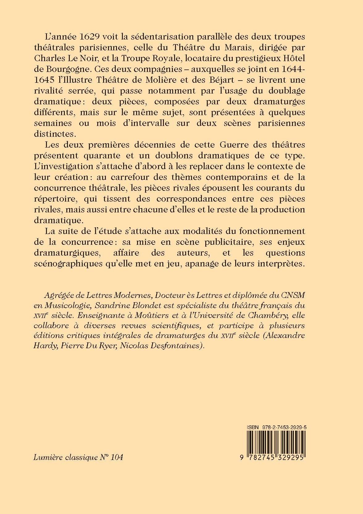 Les deux premières décennies de cette Guerre des théâtres présentent quarante et un doublons dramatiques de ce type. L’investigation s’attache d’abord à les replacer dans le contexte de leur création : au carrefour des thèmes contemporains et de la concurrence théâtrale, les pièces rivales épousent les courants du répertoire, qui tissent des correspondances entre ces pièces rivales, mais aussi entre chacune d’elles et le reste de la production dramatique.
