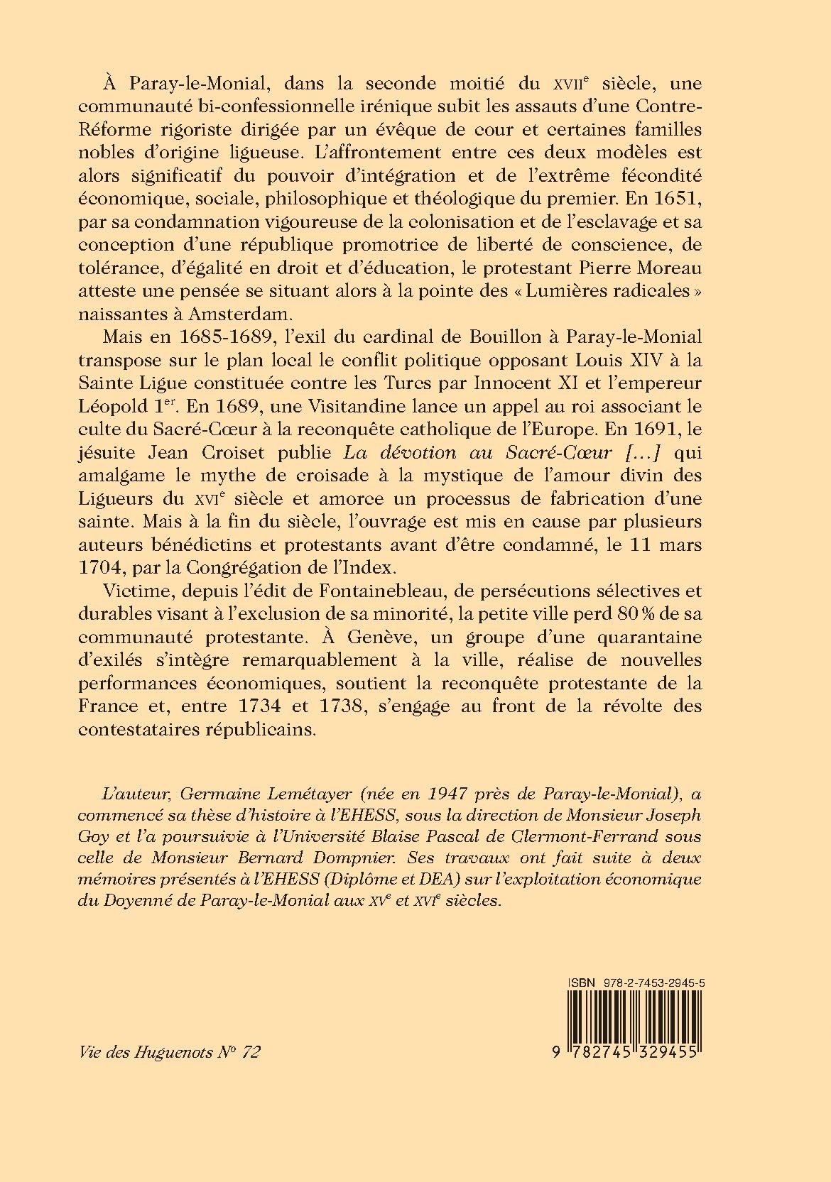 This study traces the history of the Protestant community of Paray-le-Monial, from its harmonious cohabitation with the local Catholic community and its contributions to “radical Enlightenment” in the 17th century, to its partial exile to Geneva after the Revocation of the Edict of Nantes and the ensuing persécutions.