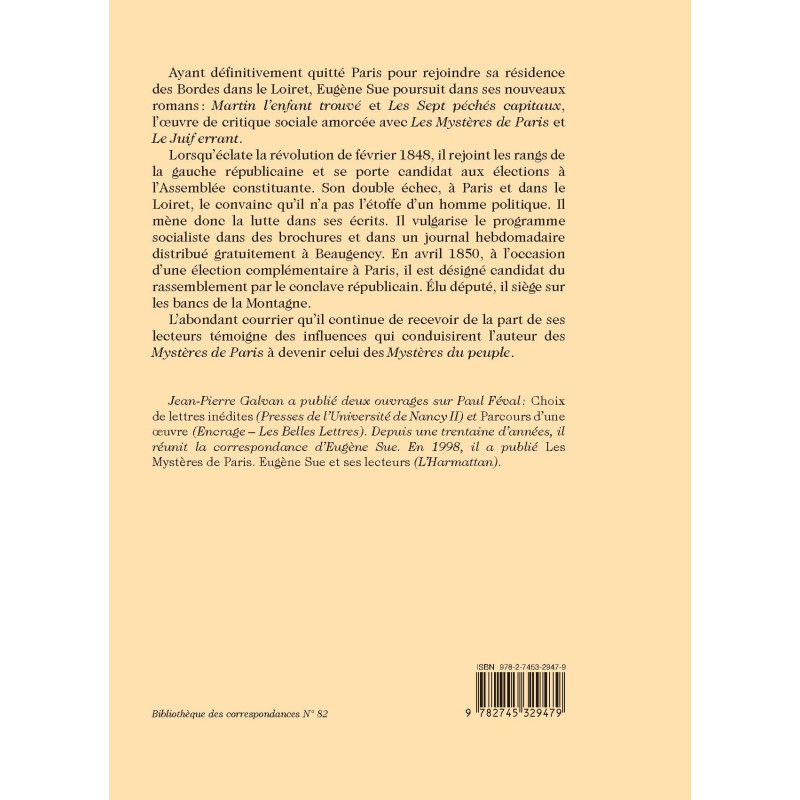 Ayant définitivement quitté Paris pour rejoindre sa résidence des Bordes dans le Loiret, Eugène Sue poursuit dans ses nouveaux romans: Martin l’enfant trouvé et Les Sept péchés capitaux, l’œuvre de critique sociale amorcée avec Les Mystères de Paris et Le Juif errant. Lorsqu’éclate la révolution de février 1848, il rejoint les rangs de la gauche républicaine et se porte candidat aux élections à l’Assemblée constituante. Son double échec, à Paris et dans le Loiret, le convainc qu’il n’a pas l’étoffe d’un homme politique. Il mène donc la lutte dans ses écrits. Il vulgarise le programme socialiste dans des brochures et dans un journal hebdomadaire distribué gratuitement à Beaugency. En avril 1850, à l’occasion d’une élection complémentaire à Paris, il est désigné candidat du rassemblement par le conclave républicain. Élu député, il siège sur les bancs de la Montagne. L’abondant courrier qu’il continue de recevoir de la part de ses lecteurs témoigne des influences qui conduisirent l’auteur des Mystères de Paris à devenir celui des Mystères du peuple.