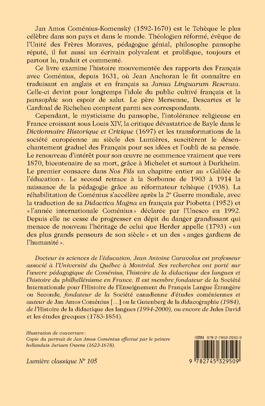 This book explores the hectic relationship between the French public and John Amos Comenius (pedagogue, philosopher, scholar) from 1631 to the present day – from initial idealization to posthumous oblivion, postwar rediscovery and consecration in 1992 (UNESCO’s “international year of Comenius”).