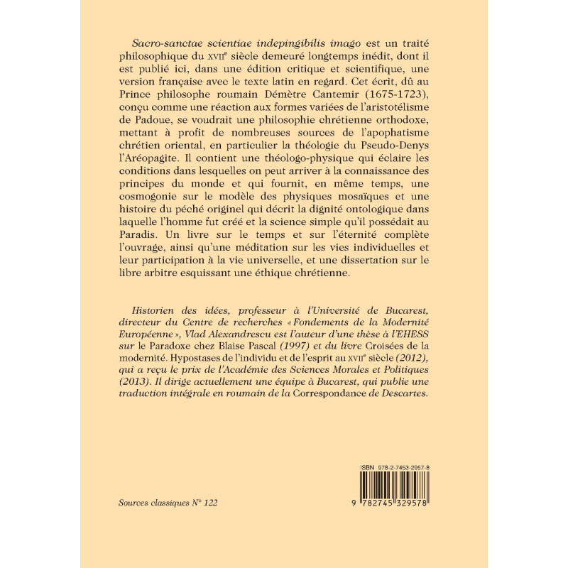 This is a critical and bilingual edition (Latin/French) of Sacro-sanctae scientiae indepingibilis imago, a 17th century philosophical treatise by the Romanian Prince Démètre Cantemir – an Orthodox Christian philosophy written as a reaction to the various forms of Paduan Aristotelianism.
