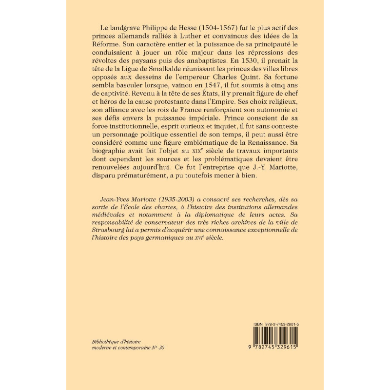 Le landgrave Philippe de Hesse (1504-1567) fut le plus actif des princes allemands ralliés à Luther et convaincus des idées de la Réforme. Son caractère entier et la puissance de sa principauté le conduisaient à jouer un rôle majeur dans les répressions des révoltes des paysans puis des anabaptistes. En 1530, il prenait la tête de la Ligue de Smalkalde réunissant les princes des villes libres opposés aux desseins de l’empereur Charles Quint. Sa fortune sembla basculer lorsque, vaincu en 1547, il fut soumis à cinq ans de captivité. Revenu à la tête de ses États, il y prenait figure de chef et héros de la cause protestante dans l’Empire. Ses choix religieux, son alliance avec les rois de France renforçaient son autonomie et ses défis envers la puissance impériale. Prince conscient de sa force institutionnelle, esprit curieux et inquiet, il fut sans conteste un personnage politique essentiel de son temps, il peut aussi être considéré comme une figure emblématique de la Renaissance. Sa biographie avait fait l’objet au XIXe siècle de travaux importants dont cependant les sources et les problématiques devaient être renouvelées aujourd’hui. Ce fut l’entreprise que J.-Y. Mariotte, disparu prématurément, a pu toutefois mener à bien.
