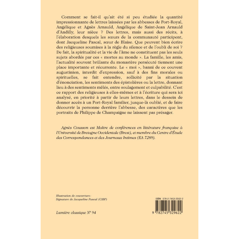 Comment se fait-il qu’ait été si peu étudiée la quantité impressionnante de lettres laissées par les abbesses de Port-Royal, Angélique et Agnès Arnauld, Angélique de Saint-Jean Arnauld d’Andilly, leur nièce ? Des lettres, mais aussi des récits, à l’élaboration desquels les sœurs de la communauté participent, dont Jacqueline Pascal, sœur de Blaise. Que peuvent bien écrire des religieuses soumises à la règle du silence et de l’oubli de soi ? De fait, la spiritualité et la vie de l’âme ne constituent pas les seuls sujets abordés par ces « mortes au monde ». La famille, les amis, l’actualité souvent brûlante du monastère persécuté tiennent une place importante et récurrente. Le « moi », banni de ce couvent augustinien, interdit d’expression, sauf à des fins morales ou spirituelles, se fait entendre, sollicité par la situation d’énonciation, les sentiments des épistolières ou la lettre, donnant lieu à des sentiments mêlés, entre soulagement et culpabilité. C’est ce rapport des religieuses à elles-mêmes et à l’écriture qui sera ici analysé, en priorité à partir de leurs lettres, dans le dessein de donner accès à un Port-Royal familier, jusque-là oublié, et de faire découvrir la personne derrière l’abbesse, des caractères que les portraits de Philippe de Champaigne ne laissent pas présager.