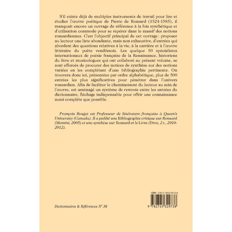 The 500+ alphabetical, cross-referenced entries in this dictionary provide a synthetic, easily navigable overview of Pierre de Ronsard’s life, career and literary oeuvre. They were selected for maximum relevance and written by some 50 international scholars, and are complemented by a bibliography.