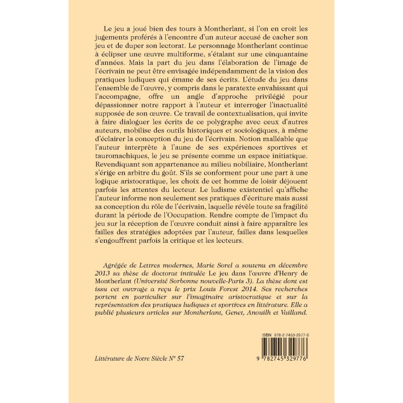 The notion of “play” has played many a trick on Montherlant, who was often accused of playing his readers and of playing with his cards too close to his chest. His playfulness influenced his writing and his conception of the writer’s role, but readers were quick to use the flaws in his strategies against him.