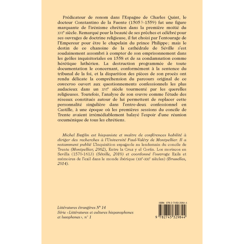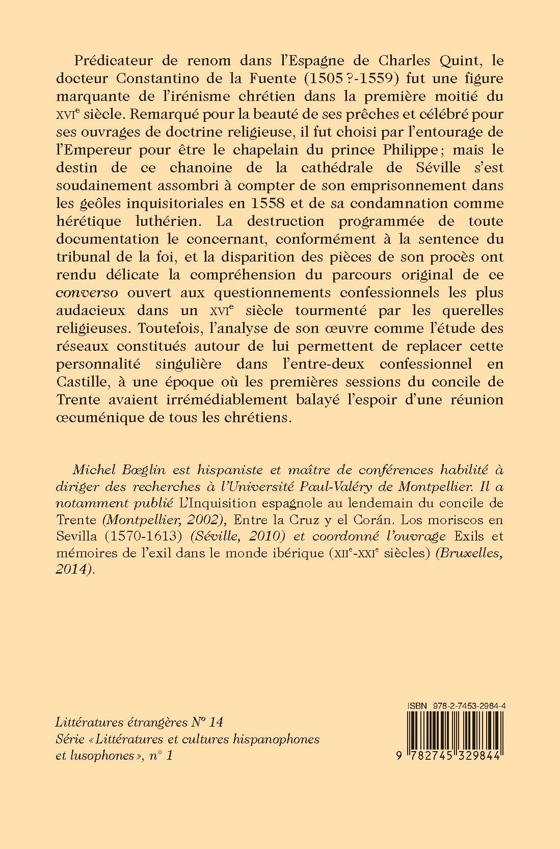 Constantino de la Fuente (1505? - 1559) was a renowned writer and preacher from Seville, a major figure of Christian irenicism, whose fate took a turn for the worse when he was convicted as a Lutheran heretic by the Inquisition in 1558. This is an analysis of his work and of the networks that revolved around him.